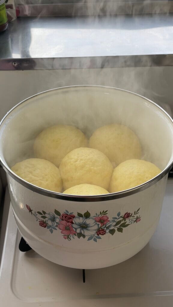 - Fill a steamer with water and bring it to a boil. Place the buns inside with the rounded side up, cover, turn off the heat, and let rest for 10 minutes.
