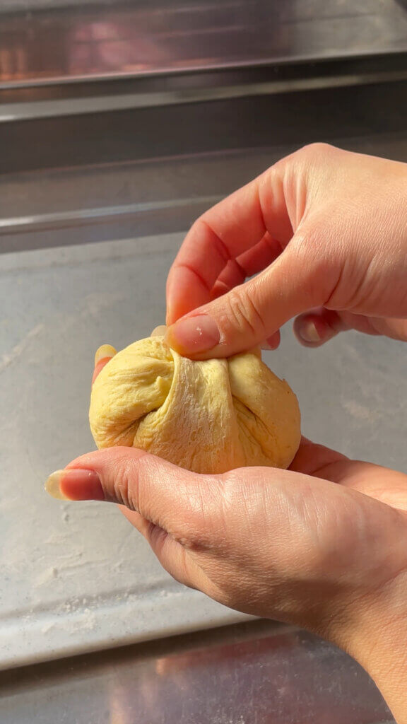 - Punch down the dough, knead for about 3 minutes, divide into 6 portions, shape into balls, and rest for 15 minutes.