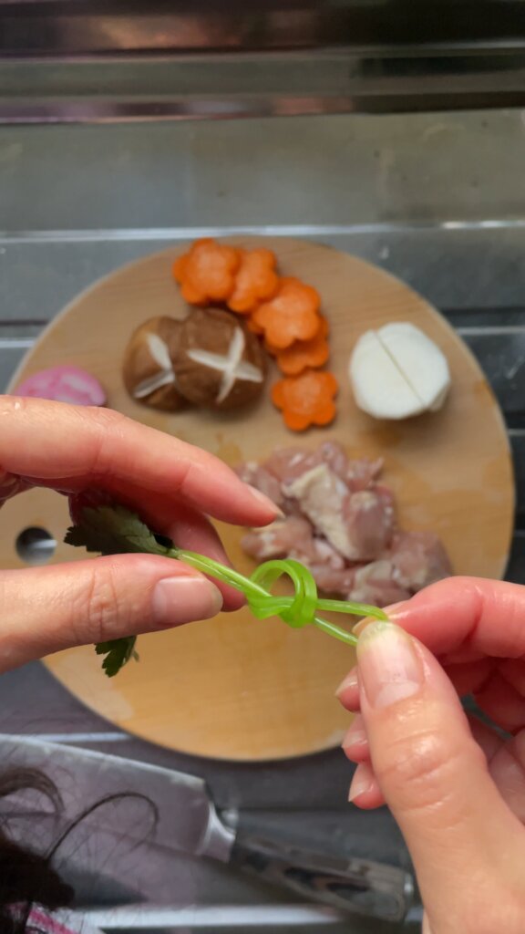 - Pour the ozoni soup into bowls and top with komatsuna, mochi, and decorate with tied mitsuba.