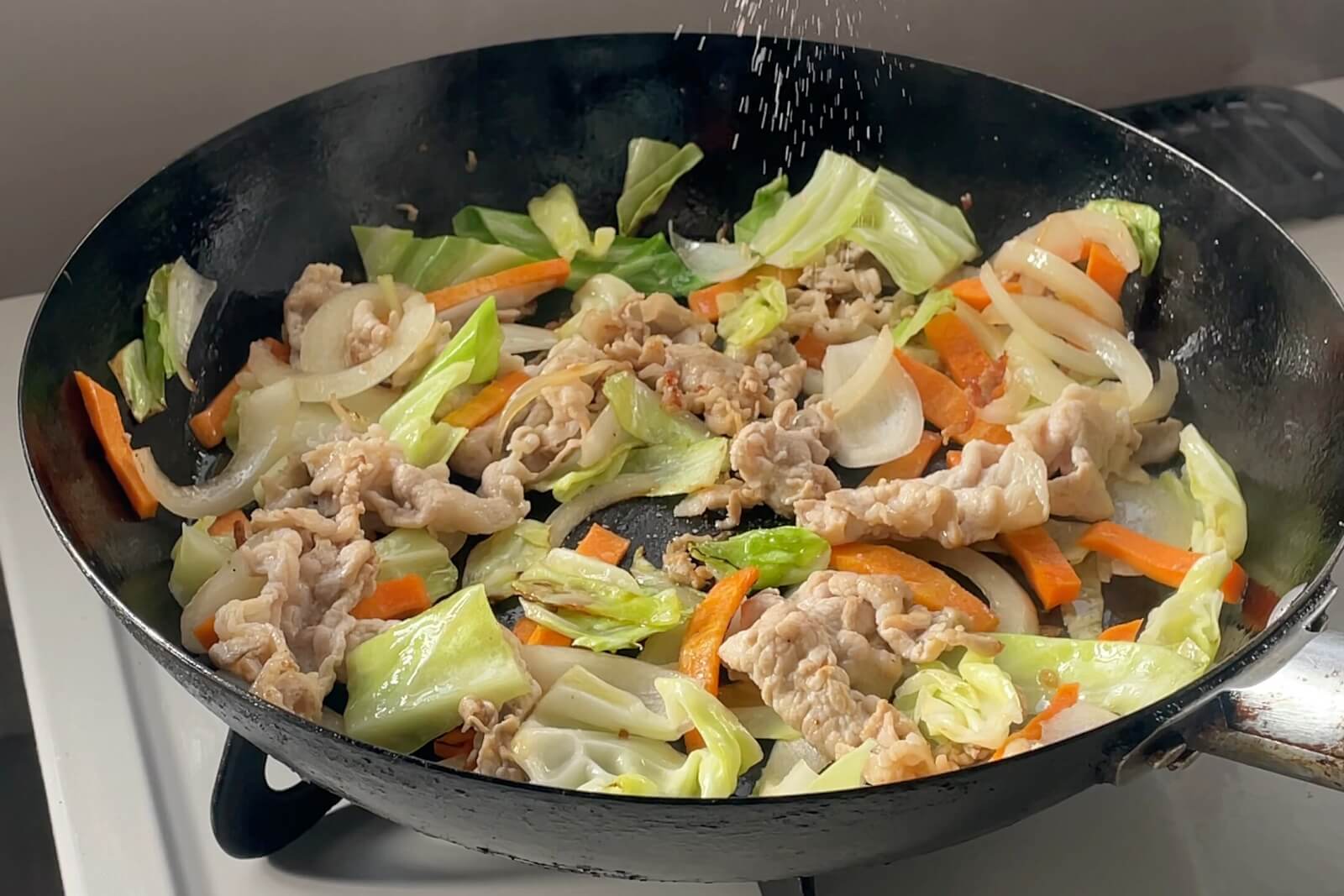 - Heat oil in a pan, cook the pork until the color changes, add vegetables, season with salt and pepper, and stir-fry until slightly tender over medium heat.