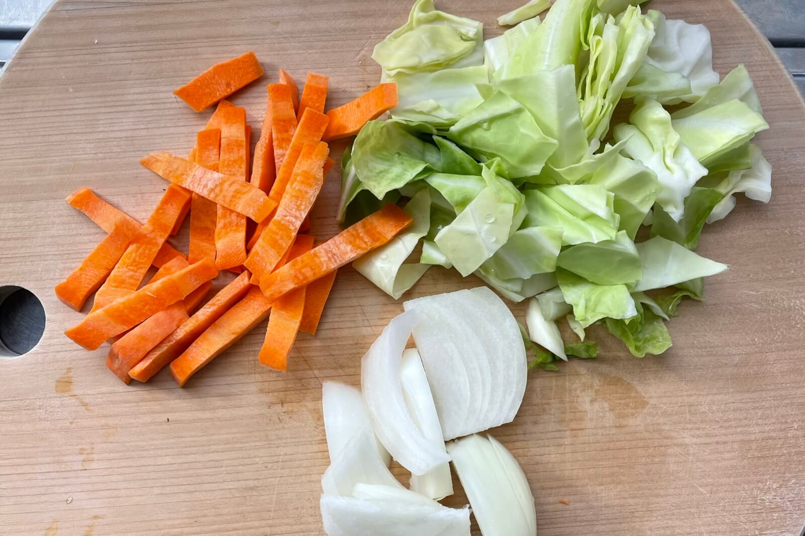 - Slice the onion, julienne the carrot, and cut the cabbage into bite-size pieces.