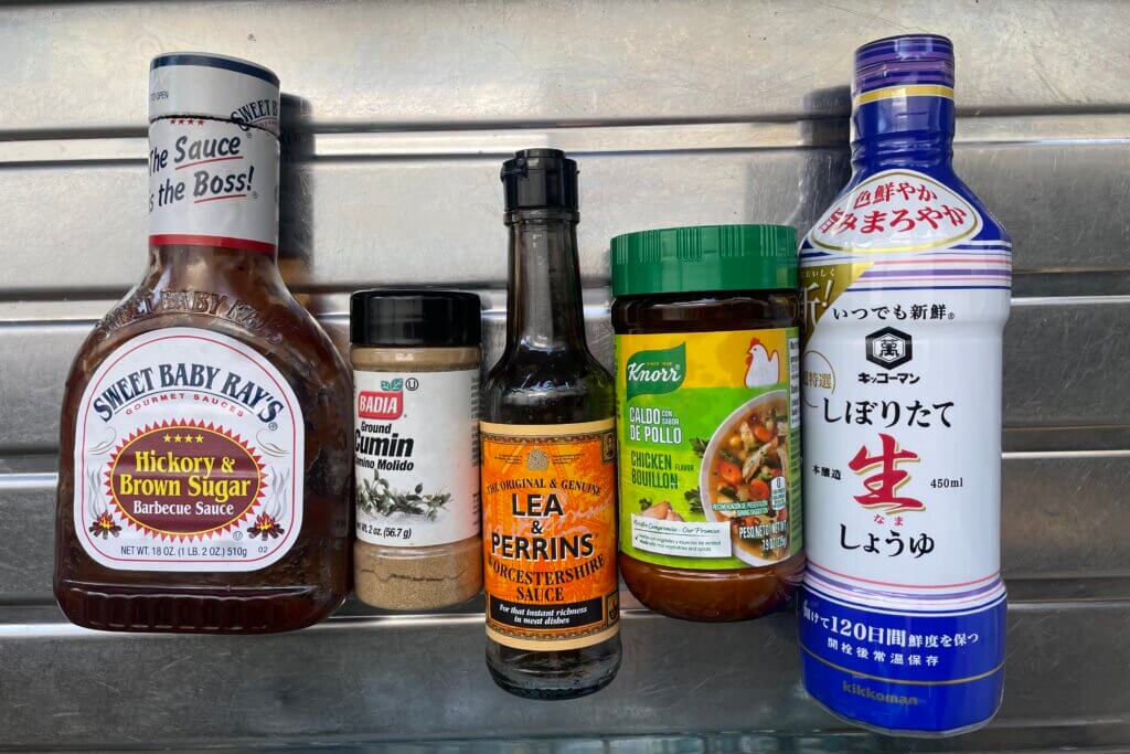 - Mix Worcestershire sauce, barbecue sauce, dark soy sauce, chicken bouillon powder, and cumin powder. Set aside.